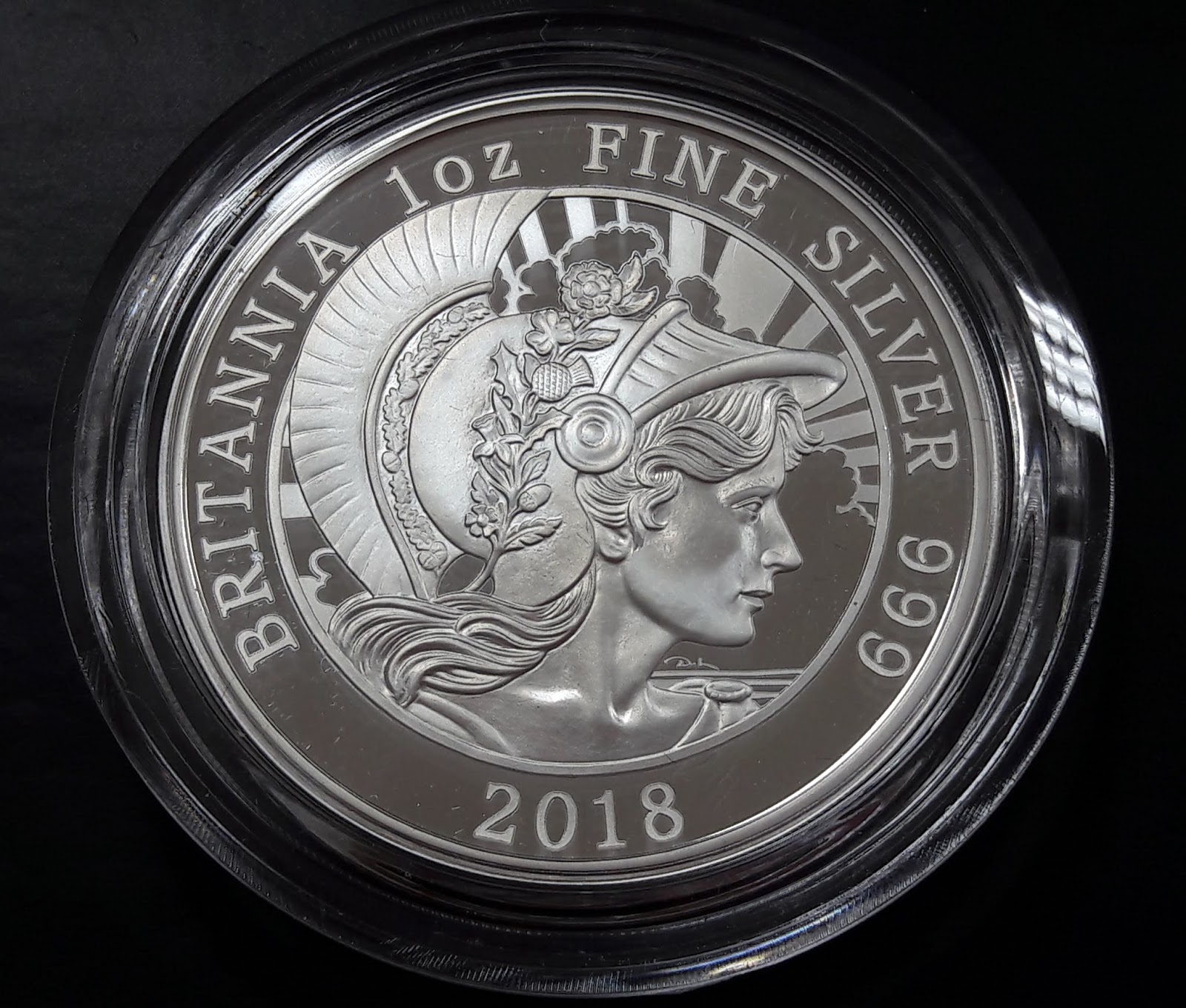 Just arrived is my latest shiny: the 2018 one ounce fine silver proof Britannia. It's legal tender, dontchaknow, with a face value of £2 (US$ 2.60, AU$ 3.50) although its true worth is somewhat diferent LOL. This is number 4882 of a limited worldwide mintage of just 7150 and weighs in at a little over 31g. Feast your eyes...